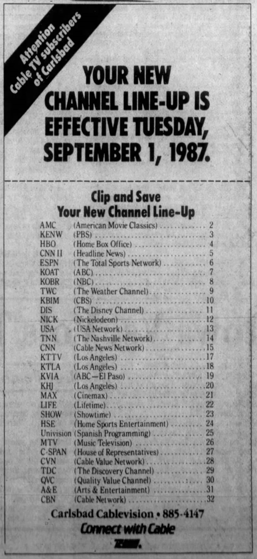 "YOUR NEW CHANNEL LINE-UP IS EFFECTIVE TUESDAY, SEPTEMBER 1, 1987" β 32 channels was state-of-the-art